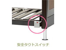 床板の高さを240ミリから超低床110ミリまで下げられる「安全タクトスイッチ」。目視による安全確認をしながら操作でき、挟み込みを予防します。
